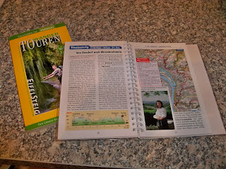 For example, I've heard some nice comments about two long trails, Reinsteig and Eifelsteig. So I thought I could check them out by picking up a couple of guidebooks about these trails. The bookstores here are filled with such guides for trails all over Germany. And they are nice books designed to fit in your rucksack and filled with color graphics, all the important logistical information (directions to the trail, location of parking, where to get a beer after the hike, or along the way), and readable descriptions of the trail. One great feature is the graph showing that elevation changes on the trail (see picture). Some guides also include GPS-coordinates for the important landmarks on the trail.